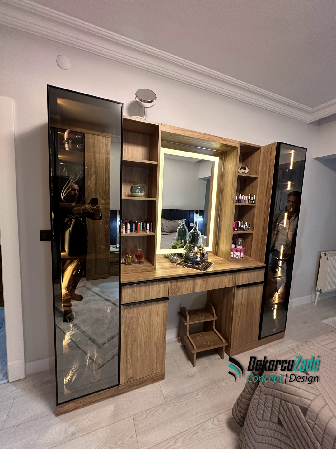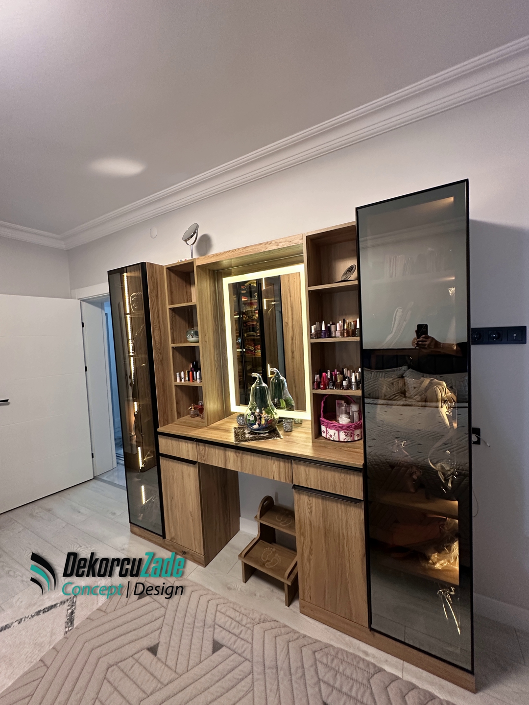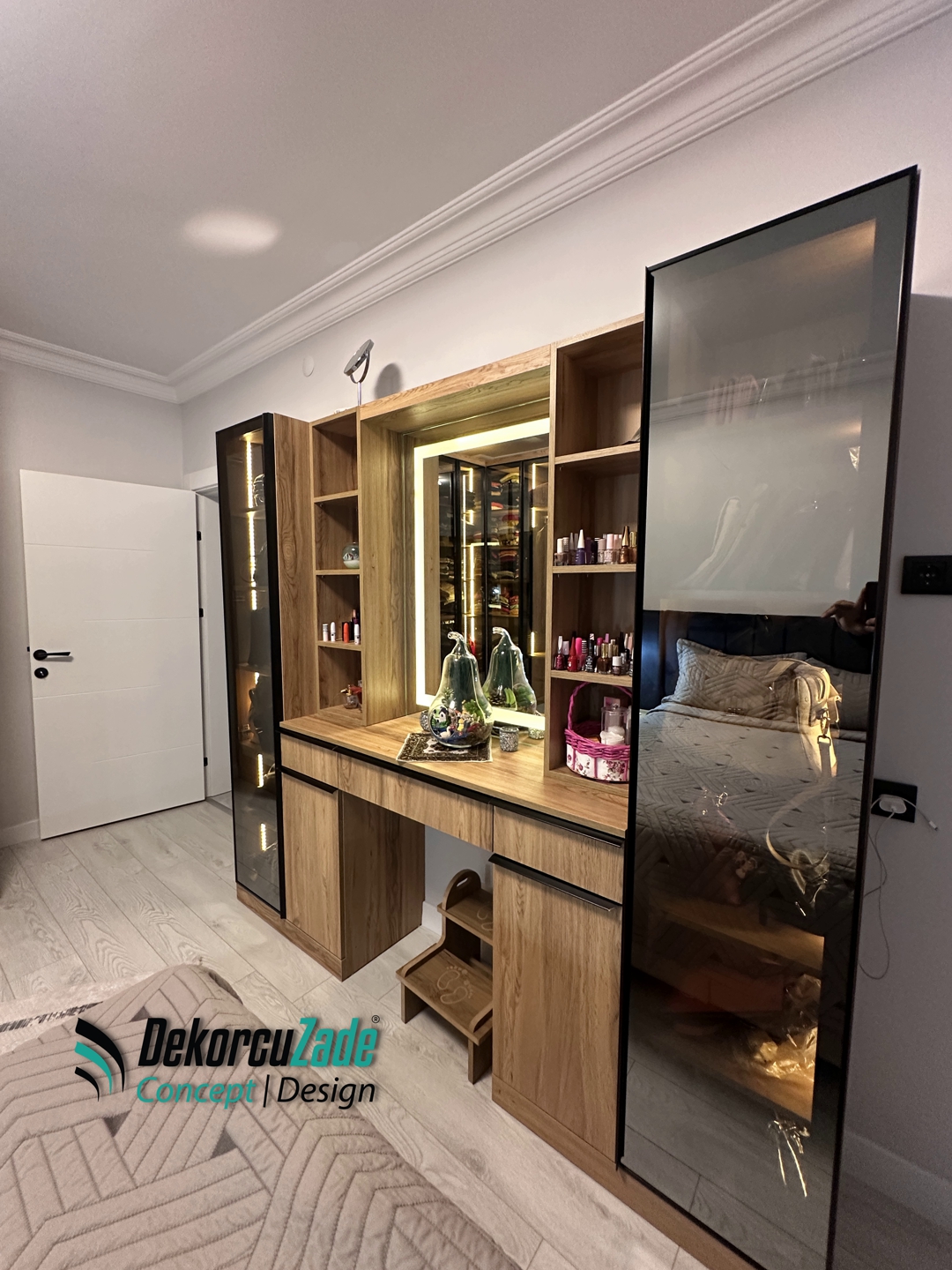 Bu projede kullanılan tüm mobilya ve dekorasyon ürünleri standart üretim yerine özel ölçü olarak tasarlanmış ve üretilmiştir.